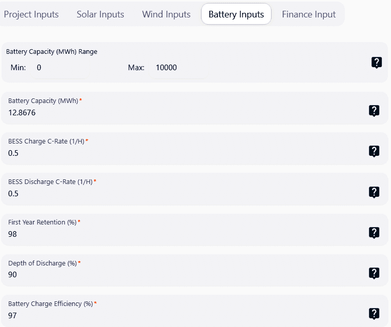 Technical: DC/AC capacity, losses, C-rate, cycle life, and more.
